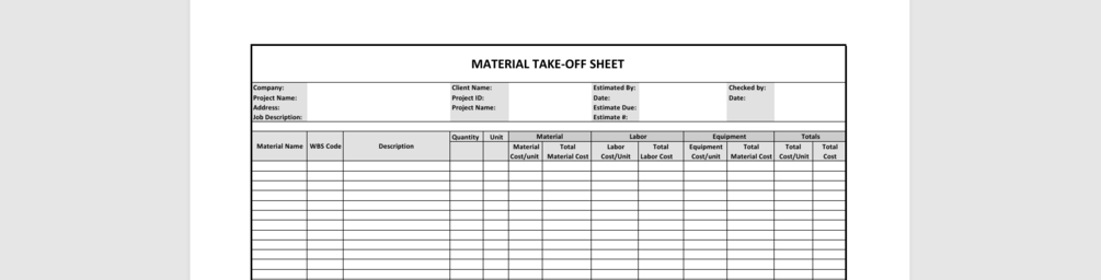 One Page Material Take-off Sheet Template