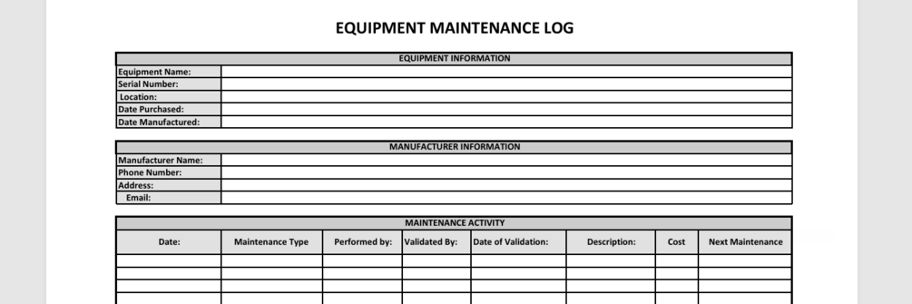 One Page Equipment Maintenance Log Template