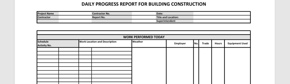 One Page Daily Progress Report for Construction